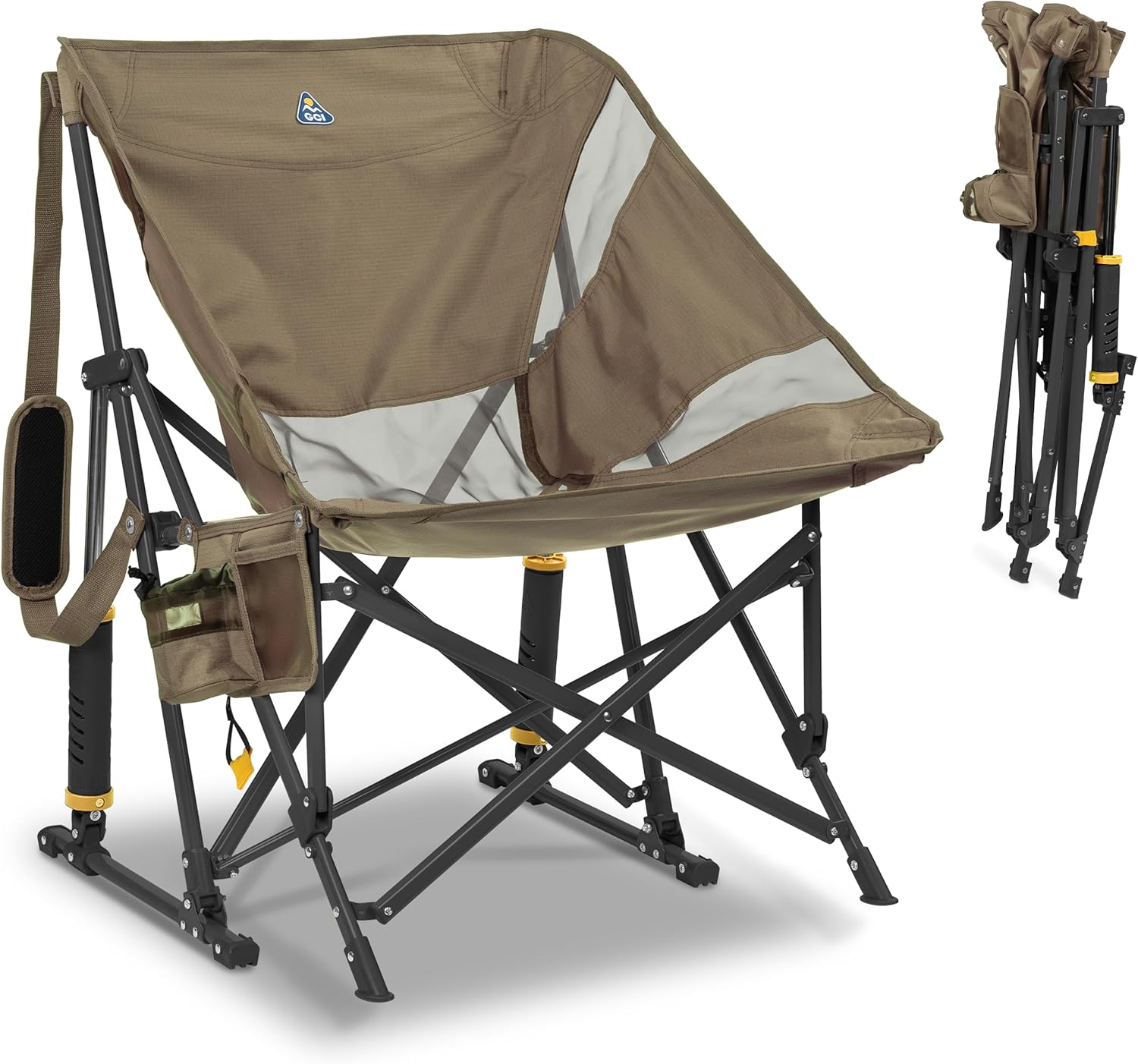 Campingstuhl mit patentierter Schaukelfunktion, was auf dem Papier interessant klingt. In der Praxis sorgt die tiefe Sitzposition aber dafür, dass man beim Aufstehen kämpft, und die 35-cm-Lehne stützt den Rücken kaum.